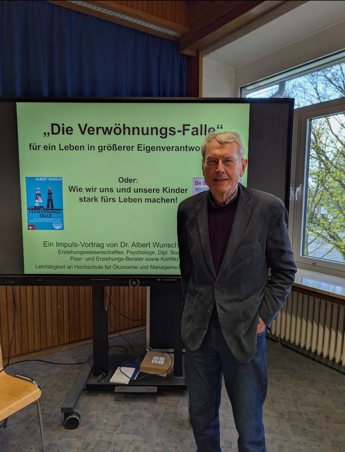 Rund 100 angehende Erzieher*innen der Fachschule für Sozialpädagogik haben eine besondere Unterrichtsstunde erlebt. Der bekannt Erziehungswissenschaftler, Psychologe und Erziehungs- und Konfliktberater Dr. Albert Wunsch hat von seinen Forschungen zum Thema Verwöhnungsfalle berichtet. Die Veranstaltung ist durch Vermittlung von Christoph Borries und die Unterstützung des Fördervereins zustande gekommen.